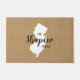 Modern farmhouse personalised doormat with your family name inside your state map. Faux burlap canvas texture background. Click Customise It to add your own text and images and create a unique one of a kind design!