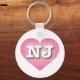 This key chain features a pink heart with a white-washed centre containing the bold, white, upper case letters NJ, the official abbreviation for New Jersey, the garden state.