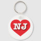 This key chain features a vibrant red heart containing the bold, white, upper case letters NJ, the official abbreviation for the state of New Jersey, the garden state.
