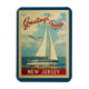 This Greetings From New Jersey vintage travel nautical design features a boat sailing on the water with seagulls and a blue sky filled with gorgeous puffy white clouds.