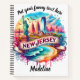 Colourful artwork showcasing New Jersey's iconic skyline, featuring the Statue of Liberty and a serene beach. A blend of urban and natural beauty captures the essence of the state at twilight.