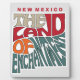 Fun and colourful typographic design with a retro feel features the state of New Mexico's nickname: The Land of Enchantment displayed within a state shaped silhouette