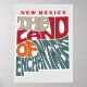 Fun and colourful typographic design with a retro feel features the state of New Mexico's nickname: The Land of Enchantment displayed within a state shaped silhouette
