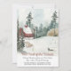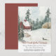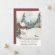 New Neck of the Woods, traditional 2-in-1 white christmas card and holiday moving announcement. Design features peaceful watercolor winter landscape of a lakeside cabin, pine trees and a snow field with a sledge and a duck on the lake. The wording reads "New Neck of the Woods" in neat handwritten typography and the template is set up for your personalised text.