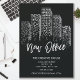 Announce your new office address to your customers with our modern city sky scrappers announcement card set on a black background. Easy to customise with your new address, phone # & email address.