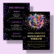Customisable New Orleans bachelorette weekend itinerary invitation. Featuring a colourful Mardi Gras masquerade mask and glitter print on a black background with gold foil lettering. On the reverse there is a template for you to customise with your own itinerary details.