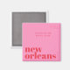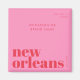 Magnet with a modern New Orleans napkins featuring bold red typography on a pink background. The word "New Orleans" is split stylishly across two lines in decorative lowercase letters, with customisable text above for names, event titles, or party themes. Perfect as a customisable keepsake or Marketing item.