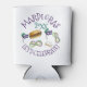 Can cooler design features an original illustration of a Mardi Gras mask, beignet, beads and shrimp po'boy sandwich.