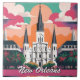 "new orleans louisiana travel", "st louis cathedral church", "retro colourful postcard poster", "jackson square castle usa", "french quarter america tourism", "american houses tourist souvenir", "vintage antique buildings", "famous landmark palm trees", "classic sights sites to visit", "vibrant hot pink orange sky"