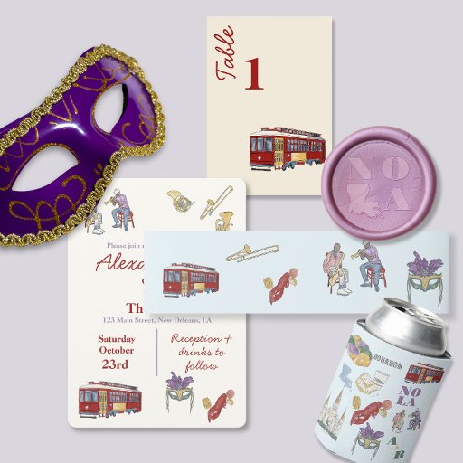 Elevate your wedding reception with these beautiful New Orleans wedding napkins. Each napkin features charming watercolor illustrations of iconic New Orleans landmarks and activities, from the St. Louis Cathedral to jazz musicians. Perfect for adding a touch of NOLA charm to your table decor, these napkins are sure to impress your guests. Celebrate your love with a taste of New Orleans with these delightful watercolor wedding napkins.