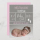 Baby birth stats are an exciting thing to share with family and friends. Announce the birth of your newborn baby girl with this modern design featuring fun and streamlined typography, stylish and mod. Pink, Grey and white colours ready to be personalised with baby's photo, birth statistic information such as birth date, weight, length, and full name.