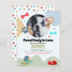 The vibrant design bursts with bright colors, playful hearts, and adorable dog-themed accents like paw prints, bones, and collars—perfect for capturing the excitement of puppy parenthood. Personalize it with your pup's name to make the announcement uniquely yours.