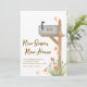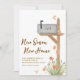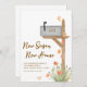 This fall moving announcement card features a watercolor mailbox and autumnal leaves. It says "New Season New Home" in stylish typography. Easily customisable with your new address and house number on the mailbox. Original Watercolor © Michele Davies.