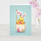 This card features a soft blue background that sets a calm spring setting, with a round yellow baby bird character peeking from a cracked eggshell. The little character has long bunny-like ears with pale pink inner details, and its wide dark eyes and rosy cheeks give it a tender, friendly look 🐰. A magenta bow tie sits neatly at its neck, adding a sweet, dressed-up touch beside its open beak shaped into a smile. The eggshell below acts like a cozy cradle, decorated with tiny long-eared figures and scattered colorful shapes that suggest a festive day. In one small wing, it holds a white pennant flag where the word “Easter” appears in bright pink lettering near the center of the flag 🐇. Soft, diffused lighting creates gentle shadows under the shell and along the character’s rounded body, giving the scene a lightly dimensional feel. The overall palette blends yellow, pink, and blue in smooth transitions that keep the focus on the character and its flag. The cracked shell shows jagged edges with patterned sections wrapping around the lower half.