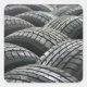 Photograph of neatly packed new tires printed to edges of sticker.