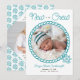 New to the Crew baby birth announcement card, personalised with your photos on the front and back. Nautical design with rope photo frame and captain's wheel in teal and white colour palette. You can add baby's name, date of birth and any other birth stats on the front as well as your personalised message on the back.