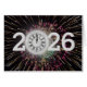 Fireworks with a clock on a full moon showing a minute after midnight for New Year 2026