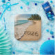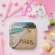 Golden sand stretches along a palm-lined beach with the number "2026" written in the sand