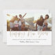 Bold modern silver and white script script text, 2 photo new year holiday card. With star burst backer design. Available in different colours.