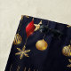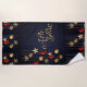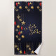 A dark blue towel with a New Year's design. The design includes gold stars, snowflakes, and ornaments, as well as red ornaments. The words "New Year" are written in gold cursive in the centre of the towel. The towel is folded at the bottom, revealing a white interior.