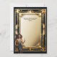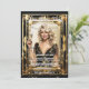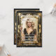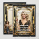 An ornate faux gold vintage art deco style frame has a beautiful illustration of a fair skinned blonde woman with long shoulder length hair wearing a low cut black sequin dress, holding up a glass of sparkling wine to toast in the New Year. She is framed by an ornate and luxurious art deco style golden frame which compliments her black tie, formal dress perfectly. A melanin woman also wearing an upmarket and tres chic figure hugging dress is also holding up a toast to the celebrations and has the same ornate frame surrounding her. Templates for your custom wording appear on both the front and the back of the invitation and may be personalised to suit your special occasion. These are perfect for gay woman hosting a singles party; for a golden wedding anniversary; a black tie event or a fabulous "new years party" celebration.