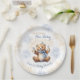 Cute and funny New year's baby shower paper plates with an adorable baby bear with milk baby bottles and fireworks in blue and beige champagne colours. Easily personalise the text. Kate Eden Art