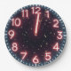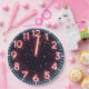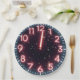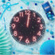 A neon clock glows brightly against a dark background, with its hands pointing to midnight with falling gold confetti