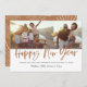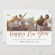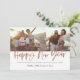 Bold modern black and white script script text, multi photo new year card. With star burst backer design. Available in different colours.