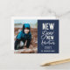 New Year New Adventures, holiday photo postcard. Features modern chic white typography on navy blue with single photo on front.