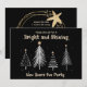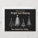 New Years Eve Black and Gold Holiday Party Invitation. The invitation is decorated with modern white Christmas Trees on a black background. The text includes: Please Join Us For A Bright and Shining New Years Eve Party. The reverse text includes: The Date, Time, Location, Host and RSVP Info. To personalize, simply insert your details into our easy template, replacing the sample text.