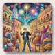 Immerse yourself in the festive spirit of Latin America with this captivating illustration. This vibrant scene depicts a lively village coming together to ring in the New Year. Colourful traditional clothing adorns the dancing figures, while festive decorations like twinkling lights, confetti, and streamers create a magical atmosphere. At the centre of the celebration stands a smiling elderly man, symbolising the passing of the old year. He holds cherished tokens representing a prosperous year ahead: a bundle of wheat, a piggy bank, and a small house. The background bursts with fireworks illuminating the night sky above charming colonial-style buildings. This joyous artwork captures the essence of the celebratory spirit and the hope for a bright new beginning.