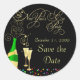 New Year's Eve Party - Save the Date Sticky Labels. Cheerful and f, elegantly styled event invitation envelope seals. Decorated with champagne, glasses, bubbles and swirls. Perfect for sealing holiday party invitation envelopes. Matching cards, invitations, postage, and gifts available in gallery.