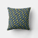 This throw pillowhas a mid-century modern design of ovals in navy with semi-circles in shades of yellow and shades of grey in them on a field of black.