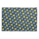 This pillowcase has a mid-century modern design of ovals in navy with semi-circles in shades of yellow and shades of grey in them on a field of black.