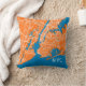 Modern throw pillow features a cool New York City map in a trendy bright orange and blue colour palette, with "NYC" presented in stylish urban typography, right justified in the bottom right hand corner.