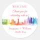 New York city skyline is an original watercolour painting by artist Monika Howarth Wedding favours stickers. New York City skyline is a panorama of Statue of Liberty, Brooklyn bridge, Empire state building, and sky scrapers. A colourful painting with rainbow effect.