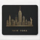 A clean and elegant graphic illustration featuring the iconic New York City skyline. Key landmarks like the Empire State Building and the Statue of Liberty are rendered in a minimalist, golden line art style. The text "NEW YORK" is written in a matching golden font below the cityscape. The design is set against a solid dark gray background, creating a sophisticated and modern esthetic.