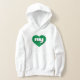 This hooded sweatshirt features a vibrant green heart containing the bold, rounded, white lower case letters ny, a playful version of the abbreviation for the state of New York, the empire state.