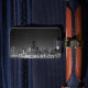 This fine art black and white photo features a classic, timeless view of the New York City skyline at night. The skyscrapers and buildings of midtown Manhattan stand out in contrast to the smooth water of the East River which reflects the lights from the cityscape.