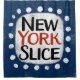 A fun and cute typographic message design that says "New York Slice". It has black and red text on a white rectangle with funky, playful white dots surrounding it, all on a blue background.