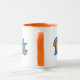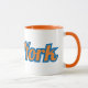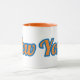 This custom coffee mug features a design that displays the word "New York" in a Lobster print font with orange coloured letters blue outline in this custom state pride jersey style theme. The rim & handle are glazed in matching colours available in 11-ounce or 15-ounce sizes microwave and dishwasher safe ceramic construction.