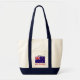 Love the durable cream colored canvas and navy blue contrasted handles. Perfect for carrying my laptop and papers.