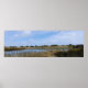 New Zealand west coast Auckland Whatipu Cave Track poster shows a sunny, blue-skied day, the wetlands stretching in front of the caves.