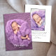 Announce your baby's arrival with our elegant birth announcement, featuring a vertical photo of your little one with their first name beautifully overlaid in white calligraphy script. You can personalise the announcement with your baby's middle and last name. On the back, there's space for an additional picture, along with birth statistics and a personal message.