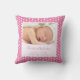 Celebrate your little one's birth with this newborn baby girl throw pillow. This adorable pillow has birth stats (date, time, length, and weight), as well as baby's first and last name and photo. The background is a dark pink with white polka dots. This pillow is a perfect keepsake and adds a beautiful personal touch to a nursery. It also makes a great gift to new parents!