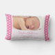 Celebrate your little one's birth with this newborn baby girl lumbar pillow. This adorable pillow has birth stats (date, time, length, and weight), as well as baby's first and last name and photo. The background is a dark pink with white polka dots. This pillow is a perfect keepsake and adds a beautiful personal touch to a nursery. It also makes a great gift to new parents!
