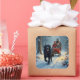A beautiful holiday painting of a Newfoundland dog running alongside a family sleigh ride. This elegant and nostalgic winter artwork brings classic Christmas magic to life.