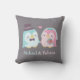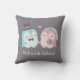 A throw pillow with a cute wedding penguin groom with top hat and bow and bride with crown and veil and holding to bouquet of flowers. Personalise with the names of the groom and bride as decorative piece for the newly wed.