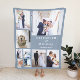 A custom dusty blue keepsake blanket for newlyweds featuring a 9 photo collage of your wedding day, honeymoon, engagement, etc., and your names and wedding date in elegant white serif typography.