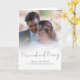 Newlywed Photo Married and Merry Christmas Folded. A budget price SMALLER 4.5” x 5.6” flat card for your festive greetings on a shiny SEMI GLOSS 110 lb card stock (similar to the thickness of a postcard) PLEASE NOTE: The envelope supplied with this card is slightly larger than the card itself. Celebrate your first married festive season along with your greetings with this modern handwritten style set script for the main header and easily personalise with your greeting and names at the bottom and inside and replace the photo with your favourite wedding photo. A gradient is overlaid on top.